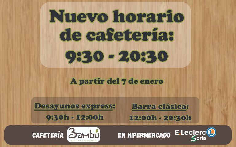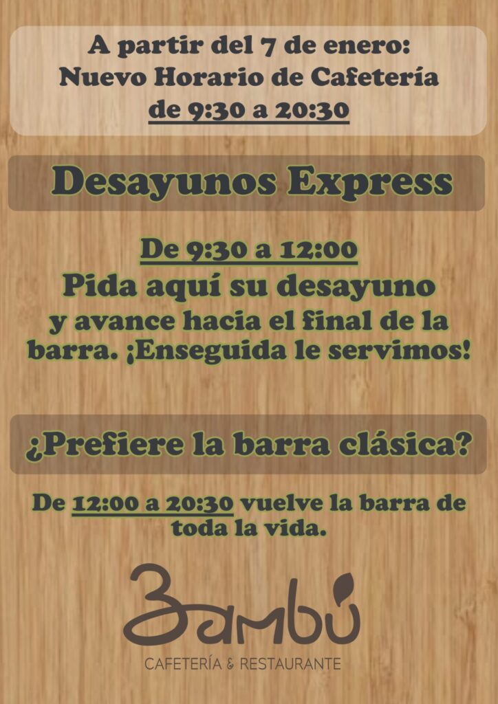 Aprovechamos para informarles que a partir del 7 de enero de 2026, nuestro nuevo horario de la Cafetería Bambú será de 9:30 a 20:30.