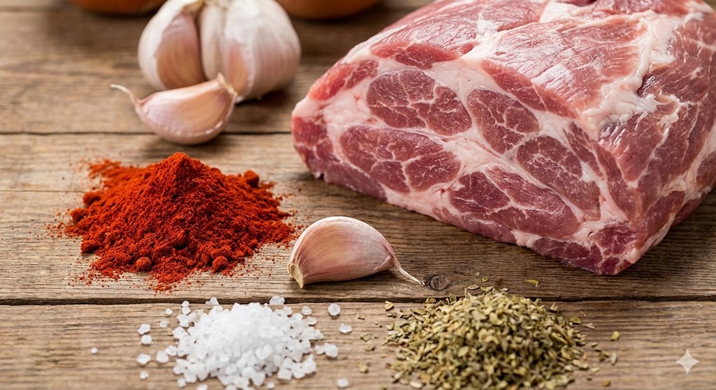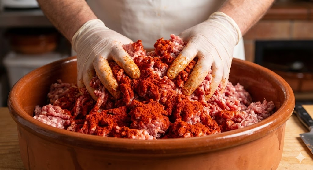 El chorizo nace de la necesidad ancestral de conservar la carne, pero se convirtió en arte gracias a un ingrediente clave que llegó de América: el pimentón. Fue esta especia la que le dio su color rojo característico (ese «rojo vivo» que hipnotiza) y sus propiedades conservantes únicas.