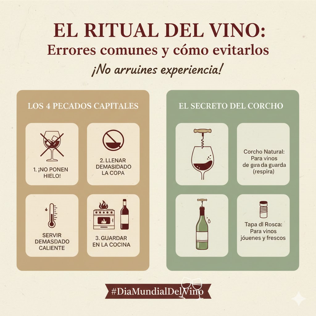 ¡Cuidado con el hielo!: Nunca pongas hielo al vino (diluyes su alma). Si está caliente, usa una cubitera con agua fría y sal.