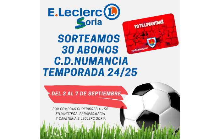 Acércate a Hipermercado E.Leclerc Soria del 3 al 7 de septiembre de 2024, realiza una compra superior a 15€ en la Vinoteca, Parafarmacia o Cafetería Bambú y gana uno de los 30 abonos que sorteamos del C.D.Numancia – Temporada 24/25.